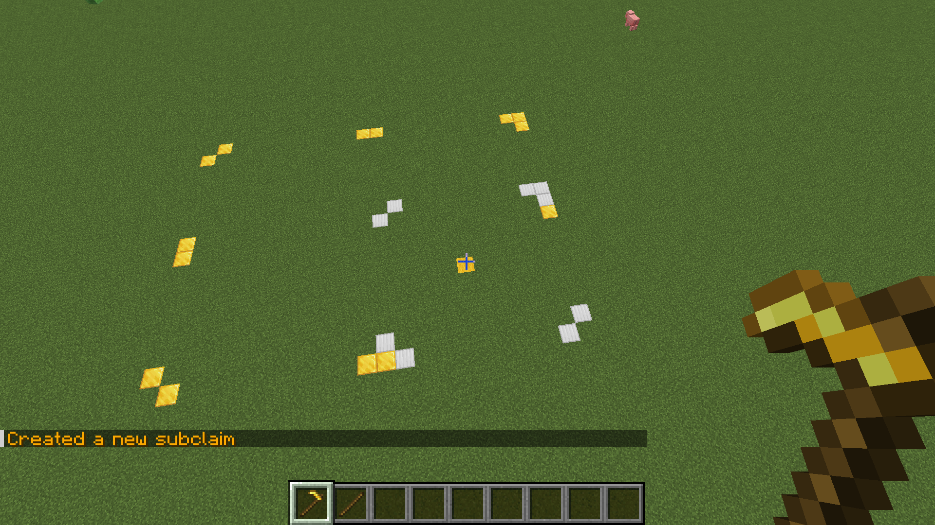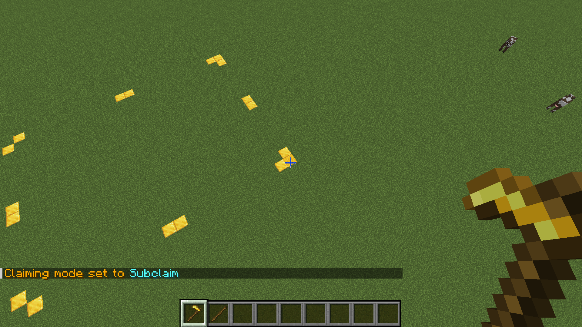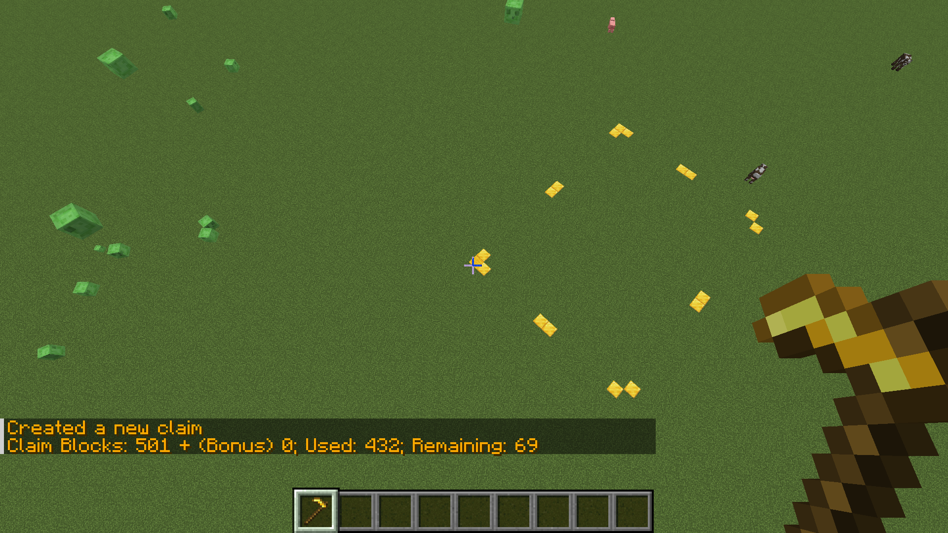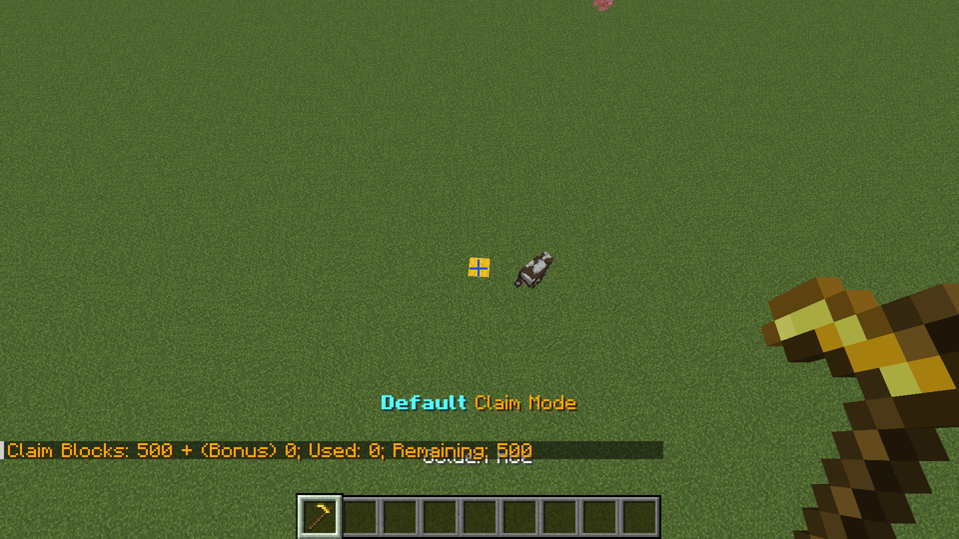 To get started the first thing you need is the claiming tool. By default the tool to create claims is a golden hoe. Holding the tool will display your current claim blocks and the amount you used.